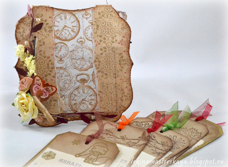 Тэги проштамповала и края затонировала дистрессом, некоторые месяцы еще и заэмбоссила золотой пудрой.