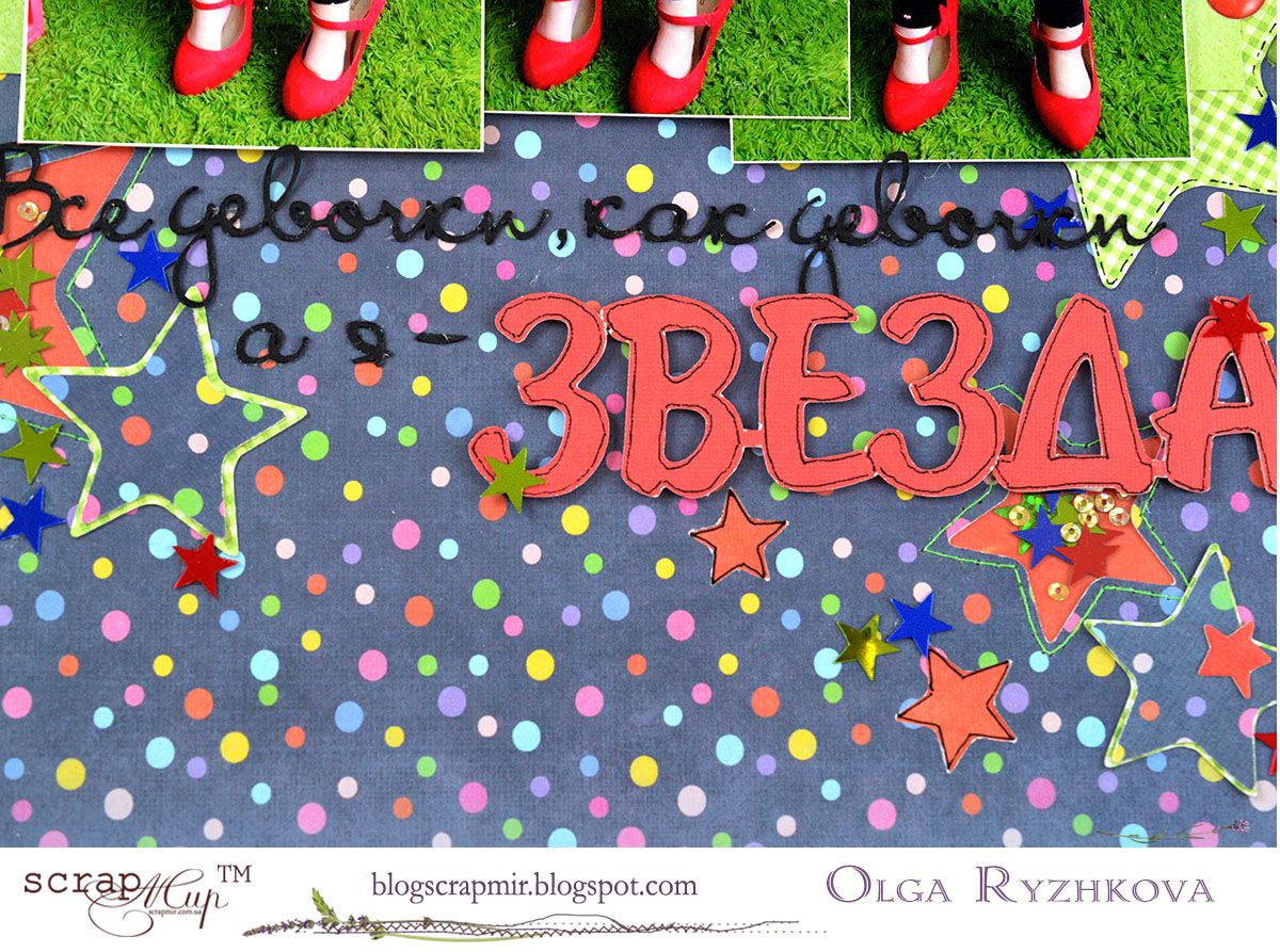 Скетчем никаким не пользовалась, фотки сами как-то задали композицию. Бумагу и декор подбирала тоже под снимки. Поэтому из всего многообразия бумаги ScrapMir выбрала темно-синий лист с разноцветными горошками Конфетти, а для подложки - лист красного цвета Вечеринка. Совсем как наряд и туфли моей модели)). Для декора мне понадобились еще обрезки листа в зеленую клеточку Цифры, эпоксидные наклейки, высечки, надписи из листа для вырезания и много-много пайеток в виде звездочек.